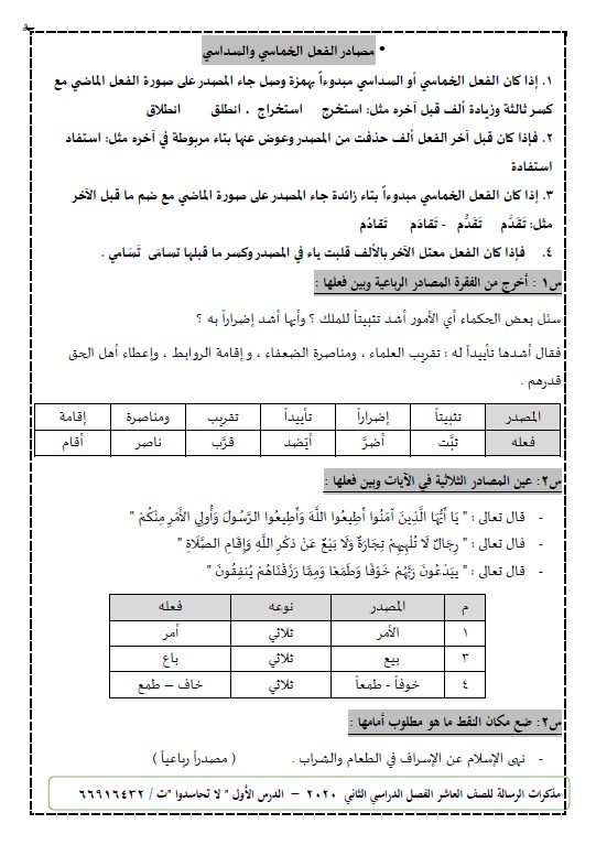 ننقل لكم ورقة عمل شارحة مصادر الأفعال غير الثلاثية لمادة اللغة العربية للصف العاشر الفصل الأول منتديات صقر الجنوب