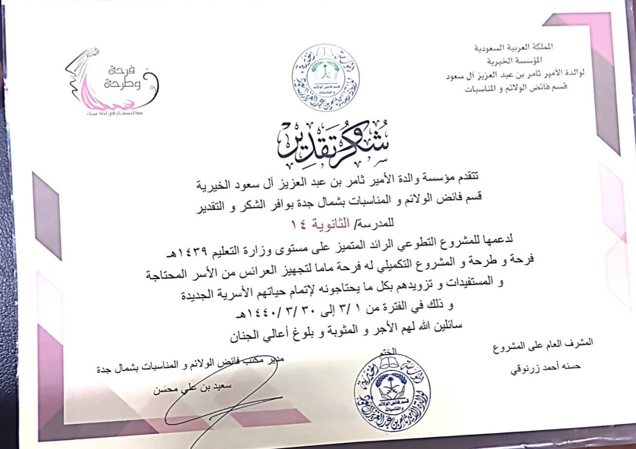 المدرسة الرابعة عشرة الثانوية On Twitter تتقدم مؤسسة والدة الأمير ثامر بن عبد العزيز الخيرية بوافر الشكر و التقدير للثانوية ارابعة عشر و قائدتها أ فتحيه حسين لدعمها المشروع التطوعي المتميز على مستوى