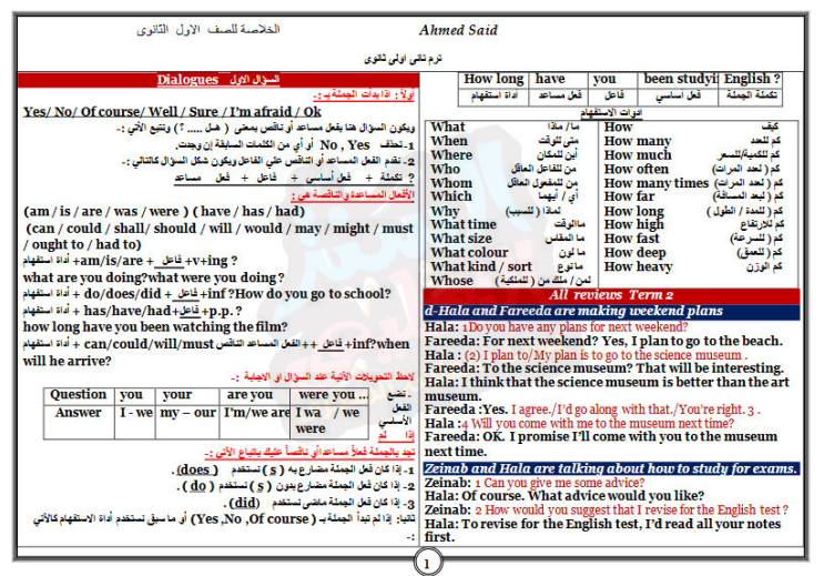 مراجعة مادة الانجليزى ملخص المنهج ترم أول الصف الاول الثانوى